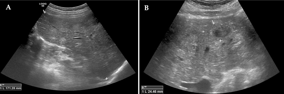 The abdominal ultrasound revealed hepatomegaly (right lobe ~171 mm) and multiple variable echogenicity liver metastases (part of which was degrading) throughout all liver segments (the biggest ~25 mm in diameter) (Figure 1, A, B). A nonhomogenous increased uterus with several calcified myomas was also observed.