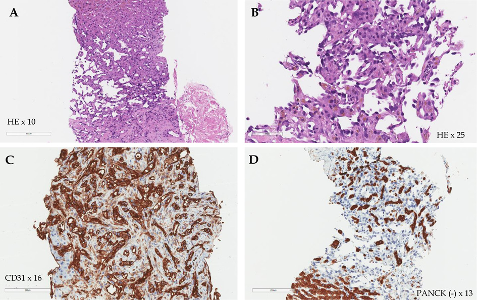 Summary. Background. Hepatic angiosarcoma is an uncommon, malignant, primary liver tumor, comprising 2% of liver cancers and accounting for < 1% of all sarcomas. Patients usually present with nonspecific symptoms, such as fatigue, weight loss, right upper quadrant pain, anemia, which leads to late diagnosis of an advanced stage tumor. The median life expectancy after the diagnosis of hepatic angiosarcoma is about 6 months, with only 3% of patients surviving more than 2 years. Liver failure and hemoperitoneum are the leading causes of death in patients with liver angiosarcoma. In rarer cases, it might cause paraneoplastic syndromes such as disseminated intravascular coagulopathy. The treatment of angiosarcomas is complicated as there are no established and effective treatment guidelines due to the tumor’s low frequency and aggressive nature.