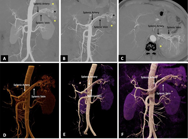 CT angiography (CTA) of the abdomen revealed multiple splenic contusions with over 30% non-enhancing parenchyma in the mid and lower poles, indicating devascularization. Several pseudoaneurysms were identified, along with early opacification of the splenic vein in the arterial phase – s/o splenic AVF (Figure 1, A–F).