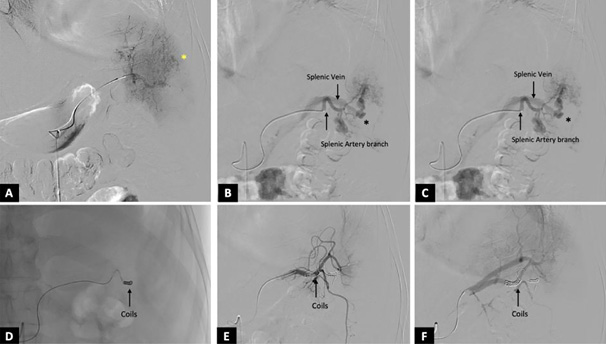 Atvejis: Pristatome 62 metų vyro, patyrusio trauminę blužnies AVF dėl eismo įvykio (RTA), susijusio su IV laipsnio blužnies sužalojimu ir daugybe pseudoaneurizmų, atvejį. Pacientui buvo sėkmingai atlikta endovaskulinė embolizacija spirale ir po operacijos jis nesiskundė jokiais simptomais.
