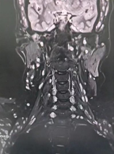 Explanation: Muscular involvement was detected through MRI, which revealed multiple cystic lesions within the extraocular, facial, and tongue muscles. The presence of an eccentric scolex inside these lesions confirmed that they were parasitic in origin, indicating disseminated myocysticercosis, which is an uncommon but clinically relevant finding.