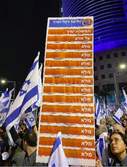 This poster, displayed by the opponents, is a quote from the hymn of the revisionist movement “Betar”, composed in 1932 by its leader, the revisionist and Zionist visionary Zeev Jabotinsky11. In so doing, the left-wing protesters appropriate the saying and thus the authority of Jabotinsky, who is considered the founding father of the Israeli right-wing parties comprising the current coalition and endorsing the reform. In intertextualising and appropriating this citation, the opponents of the reform communicate to the government and its followers that (1) they, the opponents, are endorsing the statement of the government’s ideological leader; that (2) accordingly, submitting to the government’s silencing would mean failing to fulfil their civic duty; that is why (3) the government must take notice of their objections; and most importantly, that (4) this severe crisis is an outcome of the government’s attempts to covertly restructure the political system.