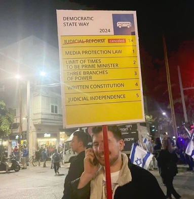 By using these lines in their posters, the reform opponents communicate their determination to defy the government’s attempt to silence the opposition, especially when the state’s democratic structure is at risk. In addition, due to the intertextual referencing, the use of these lines equates Israel’s current crisis with the threatening nature of the Capitol Hill events.