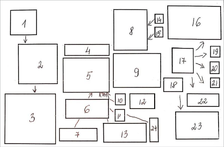 It is possible to analyse the collage data in a variety of ways, i.e., by using semiotic, compositional, discourse and psychoanalytic analysis of the content (Plakoyiannaki & Stavraki, 2018). In this research study, content analysis was used to analyse the data, and focusing on identification and interpretation of images was used for the collage (Mannay, 2010; Butler-Kisber & Poldma, 2010). Data preparation for analysis involved a two-stage strategy (Van Schalkwyk, 2010). First of all, all pictures in the collage were numbered, thereby making their schematic picture (see Fig. 3).