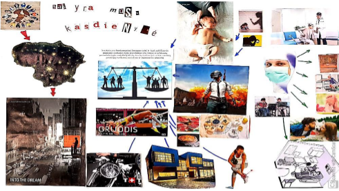 On the other hand, collage is an acknowledged research method used to reveal thoughts and experiences of research participants, understand their individual experience, analyse the meanings of concepts and ideas perceived by persons or groups thereof, and show various interpretations of social problems (Reissman, 1993). Collage as an arts-based research method allows the participants and researchers to link the “ideas in a non-linear way that brings a deeper understanding of a given phenomenon” (Kay, 2008, p. 147). Each image chosen for a collage evokes associations, memories and feelings, and also helps to connect personal experience with the existing values and attitudes. Not only the choice of individual images, but also their composition into one image too helps seeing multiple meanings of objects and phenomena as well as connections between them, thereby generating the conceptual idea of the collage. Such a study based on visual information eases the verbal communication and helps to reveal meanings and experiences that are difficult to put into words. Therefore, such a collage technique is seen as a valuable means to enter the inner world of a person (Kay, 2013).