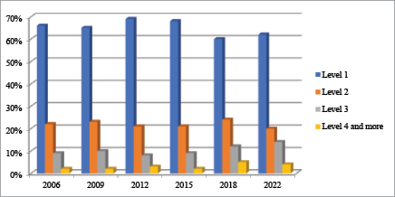 According to (OECD, 2010; 2004), PISA categorizes mathematical questions into six levels, with each level representing a different depth of mathematical understanding: Level 1: At this level, students can answer questions related to familiar mathematical contexts with clear information and well-defined questions. They can identify information and follow direct instructions in straightforward situations. Level 2: Students at this level can interpret and distinguish situations in mathematical contexts which do not require more than direct deduction and extracting information. They can apply algorithms, formulas, or procedures and make direct inferences. Level 3: These students can execute procedures, including decision-making, and employ various strategies to solve problems. They can interpret and use examples from different information sources to draw direct inferences. Level 4: Students at this level can work effectively with complex, concrete mathematical situations that include constraints or assumptions. They can select and combine different examples, including symbolic ones, and relate them to real-world aspects. They demonstrate flexibility in using sophisticated skills and reasoning. Level 5: At this level, students can develop models for complex situations, work strategically with higher-order thinking skills, and evaluate different strategies for solving problems. They can criticize their actions and formulate interpretations and inferences. Level 6: These students can create models for complex problem situations, develop generalizations, and link various sources and examples of information, and transfer methods and strategies to tackle new situations. They display a profound understanding of mathematical concepts and can adapt to novel contexts effectively. Figure 1 illustrates the percentage of mathematical competencies attained by Jordanian students in PISA across all years, encompassing all six proficiency levels. (OECD, 2023).