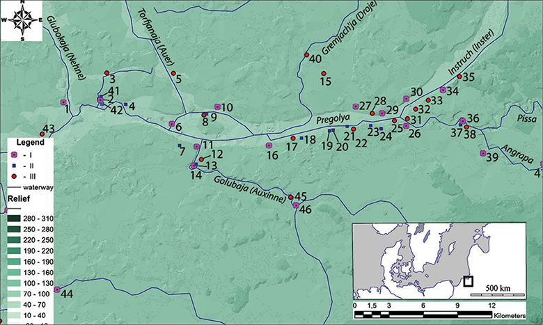 2 The western concentration of the Inster-Pregolian group of sites, located on the outbursts of the Instruch dead-ice ridge, at the so-called sandy islands on the south bank of the Pregolya river, near the present-day Gvardejsk, is not discussed in this article.