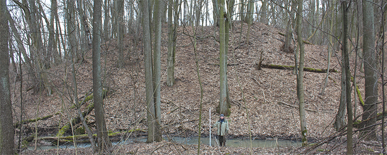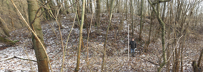 The hillfort has an elongated triangular form and oriented in the direction of the river loop. The total dimensions of the hillfort are 195 × 60 m, the area is about 1 ha. The hillfort consists of several constructive elements – two ramparts, plateaus, and ditches. On the northeast side of the field, the hillfort is bounded by a 5–7 m high rampart, in front of which traces of a ditch can be found (Fig. 9: 3). The rampart separates the first plateau of trapezoidal shape, which is about 60 × 50 m and about 14 m in height, from the river level. From the southeast side, the plateau is bounded by a ditch 4–5 m deep, behind which a second plateau of about 70 × 40 m is situated. The height of this plateau from the river level is about 8–10 m. The slopes of both plateaus had been escarped. On the inner south side, the hillfort was probably separated by a ditch (or a dead arm of the river), which could have been filled up in the Early Modern Period, since a ramp had been made from the southern part of the hillfort.