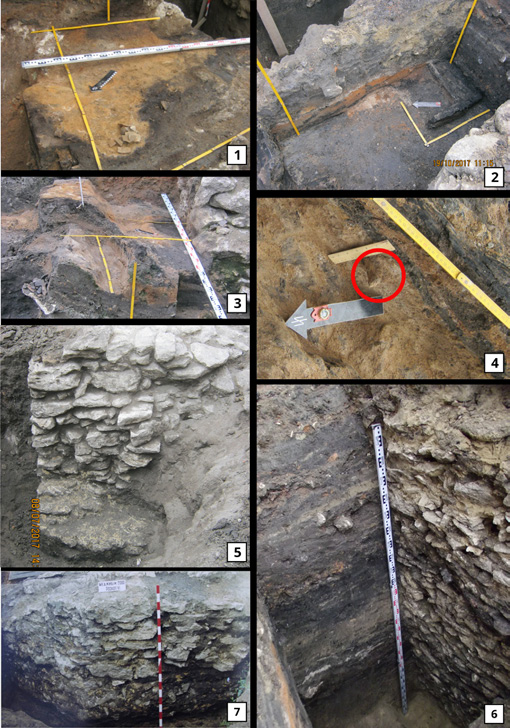 5 pav. 1 – archeologinio sluoksnio su gaisro pėdsakais tyrimai (2017 m. tyrimai). 2 – sudegusių medinių konstrukcijų fragmentai (2017 m. tyrimai). 3 – archeologinio sluoksnio su gaisro pėdsakais paviršiaus tyrimai (2017 m. tyrimai). 4 – arbaleto strėlės antgalis degėsių sluoksnyje (2017 m. tyrimai). 5 – vakarinės sienos pietinis galas su pamatų išplatėjimu (2017 m. tyrimai). 6 – akmenų struktūra prie vakarinės sienos (2017 m. tyrimai). 7 – vakarinė siena. VI perkasa, 2000 m. (V. Vietrovo nuotr.).