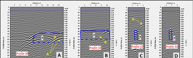 In Figure 9, a–d, the reflections, which could be attributed to the shallow stone structures, are identified because there is a significant difference in dielectric permittivity between the soil and the stones. Radargram from Profiles 1 and 2 (Fig. 9 A,B) revealed responses marked 1 and 4 originating from ‘other objects’, which were recommended for excavation.