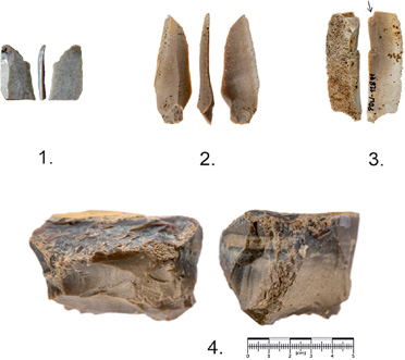 7 pav. Įrankių pavyzdžiai iš 24-osios vietovės Poręba Dzierżna. 1, 2 – nulaužta dalis; 3 – rėžtukas; 4 – kirvelis. T. Wiśniewski ir W. Ochotny nuotraukos.