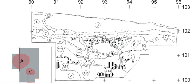 Fig 8. A. Profile W at meter 108 from Trench II. A3–A14 – anthropogenic fill layers of structure ‘A’. Areas marked with black lines – limestone rocks; B. Profile W with marked artifacts; C. Profile W with marked artifacts. Burnt or overheated finds are marked in black, while those without such traces are marked in white; D. Kernel density estimation of artifacts taking into account their weight, against the background of profile W.
