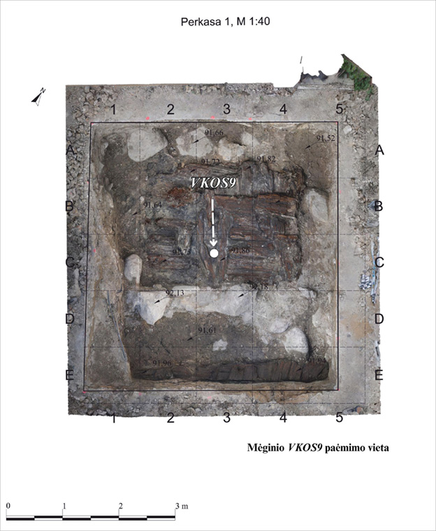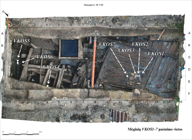 Atidengus medines konstrukcijas, iš perkasos Nr. 2 (4 pav.) buvo paimta medžių tašų mėginių dendrochronologiniams tyrimams. Gauti dendrochronologinių tyrimų rezultatai (Pukienė, 2024) šiame straipsnyje yra panaudoti datuojant 8 archeobotaninius mėginius iš perkasos Nr. 2 (1 lentelė). Perkasoje Nr. 1 buvo atidengtas medinės konstrukcijos fragmentas, kuris galėjo priklausyti keliui, vedančiam iš Kreivosios pilies į VŽP (3 pav.). Remiantis radiniais šis kelias datuojamas XIV a. Taigi dendrochronologiniai tyrimai ir surinkti radiniai leido patikslinti visų paimtų archeobotaninių mėginių chronologiją. Tikslios mėginių paėmimo vietos pateikiamos lentelėje ir vaizdinėje medžiagoje (1 lentelė, 3–6 pav.).