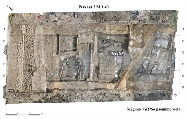 VKOS8 (apie 1350–1390 m.) mėginyje, palyginti su ankstesniais šiame straipsnyje pristatomais mėginiais, aptikta daugiausia botaninių liekanų. Iš viso surinkta daugiau nei 3216 vnt. augalų makroliekanų. Šiame mėginyje didžiausią identifikuotos botaninės medžiagos dalį sudaro šlapynių grupei priskiriami augalai (apie 39,3 %). Daugiau nei 700 vnt. jų buvo, kaip ir ankstesniuose mėginiuose, gausiai identifikuotos nuodingojo vėdryno liekanos. Miškų ir proskynų grupei priklausantys augalai sudaro apie 26,7 % surinktos kolekcijos. Joje daugiausia aptikta nusvirusiosios striepsnės (Melica nutans, daugiau nei 600 vnt.) vaisių fragmentų. Piktžolių ir ruderalinių augalų grupė sudaro apie 24,3 %, nenustatytos augavietės – apie 4,8 %. Įvairūs kultūrinių augalų fragmentai mėginyje apima apie 4 % identifikuotų augalų. Šioje grupėje daugiausia surinkta tikrųjų sorų (89 vnt.) ir jų žiedažvynių (27 vnt.) liekanų.