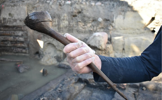 1 pav. T. Kosciuškos g. 1 tyrimų metu rasta medinė lazda su buožele (L. Banionytės nuotr.).