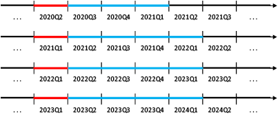 We define the dependent variable as a binary default indicator, which was calculated as follows. If the household was in default on its mortgage on 1 January of a given year, such a borrower was excluded for this year. If the borrower was not in default on its mortgage on the 01 January of a given year and then did not default during the year, the default indicator equals 0. Otherwise, if the borrower was not in default on its mortgage on 1 January of a given year and then defaulted during the year, the dependent variable equals 1. As a result, we obtained a dataset with only 6% of defaults, that is, highly unbalanced. This number corresponded to banks’ assessment of the probability of default on the given time horizon. Consequently, we used a maximum of four data points for each borrower (corresponding to default status in 2020, 2021, 2022, and 2023). The schematic representation of the construction process of the dependent variable is shown in Figure 1.