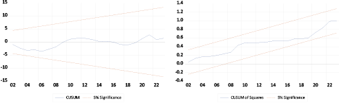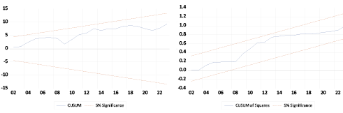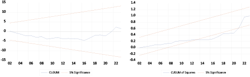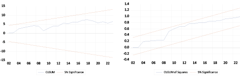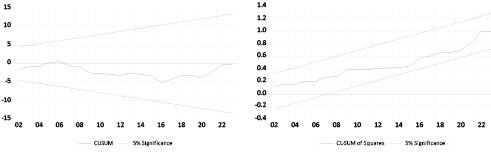 The Granger causality test based on VECM investigated the causal relationship between financial development and economic growth. The test results indicate that the credit supply to the private sector is the leading cause of short-term and long-term economic growth. Using money supply growth as the indicator for financial development revealed no causal relationship. The causality test results show a short-term causality from the openness indicator to bank credits given to the private sector. In addition, there is a two-way causality between the openness indicator and broadly defined monetary growth in the short term. Table 4 presents diagnostic tests at the bottom to assess the robustness of the model. Diagnostic tests include the Breusch-Godfrey serial correlation LM test, the Breusch-Pagan-Godfrey heteroskedasticity tests, and Jarque-Bera normality tests. The diagnostic test results show the absence of serial correlation, the absence of heteroskedasticity, and the presence of normality.