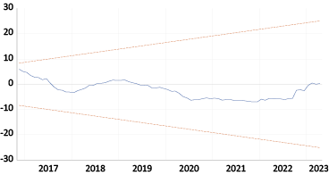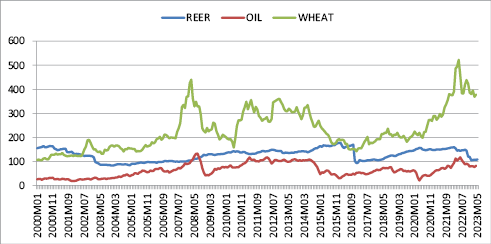 To disclose such obfuscated impacts that do not appear in the official rate until it is allowed to depreciate, it may be beneficial to compare oil and wheat prices with Egypt’s real effective exchange rate (Figure 2 with the real exchange rate having the acronym REER). REER measures a CPI-based price of a currency against some selected other currencies. As evident from Figure 2, devaluations in the previously mentioned periods returned the REER index to 100. Otherwise, the REER kept on appreciating above its market value marking the overvaluation of the LE. Strangely enough, while no clear impact seems to be from oil prices on REER, a negative relation sometimes appears from wheat prices to REER. The periods 2000–2003, 2007–2016, and 2016–2023 provide some evidence of this negative relation. The negative relation means that as the international price of wheat falls REER rises or the LE becomes overvalued. In other words, the decrease in wheat prices creates a downward pressure on the LE. This is strange as it is expected that the rising – not the falling – price of wheat would mount pressure on the LE through its impact on the import bill.