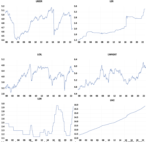 Predicated on the exchange rate theories and earlier research, the most fundamental macroeconomic control factors that can explain the changes in the currency values are the interest rate and monetary aggregates. We use monthly data starting 2000M1 until 2023M3. The CPI-based monthly real effective exchange rate is used after being transformed into natural logs and given the acronym LREER. It is worth noting that the value of a currency relative to a basket of other currencies is determined by the real effective exchange rate. The data comes from Bruegel’s database. LER is the monthly nominal exchange rate’s natural log; that is, the logged value of $1 expressed in LEs. The natural log of Egypt’s monthly discount rate is used to represent the interest rate and given the acronym LDR. The Egyptian monthly consumer price index, or LCPI, is the natural log of the CPI, and is used to represent the price level. LM2 is Egypt’s broad money expressed in natural logs. The data for LER, LDR, LCPI, and LM2 comes from both the International Financial Statistics (IFS) database of the International Monetary Fund (n.d.) and the Central Bank of Egypt (2023) (for the recent figures not recorded in IFS). LWHEAT is the natural log of wheat’s “no. 2 hard red winter Gulf export price; June 2020 backwards, no. 1, hard red winter, ordinary protein, export price delivered at the US Gulf port for prompt or 30 days shipment” (Indexmundi, 2021a) with the price valued in US dollars for each Metric Ton. LOIL is the natural log of “crude oil average spot price per barrel of Brent, Dubai, and West Texas Intermediate, equally weighed” (Indexmundi, 2021b). The data also come from the IndexMundi data portal. Figure 3 shows the logged time series of the selected variables.
