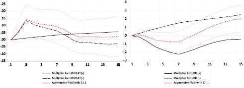 Wald tests confirm our NARDL results (Table 8). In the short run, no short-run negative impact of oil price and no short-run positive impact of wheat price on the LE appeared, thereby indicating the asymmetric impacts of oil price and wheat price changes on the LE. In the long run, the null hypothesis of the absence of symmetry in the impact of the oil prices on the exchange rate is rejected at the 5% significance level, which confirms the asymmetric impact of the oil price. However, concerning the wheat price level, it is clear that the null hypothesis is not rejected, which confirms the nonexistence of asymmetry in the long run. It should be noted here however that the NARDL results showed that both the positive and negative coefficients for both variables were insignificant in the long run.