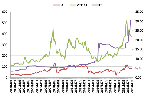 The theoretical context of the oil price and exchange rate nexus can be generalized to encompass wheat in many respects. With respect to the portfolio and wealth channel, rising wheat prices can be one of the main causes of inflation for wheat-importing countries (and subsequent depreciation of the nominal exchange rate) as wealth is transferred to wheat-exporting countries as a result of the higher exports revenues (and vice versa). As for the terms of trade channel, real wheat prices can also impact domestic inflation and real exchange rate, not because industries depend on wheat for production (as in the case of oil), but because wheat or the cost of bread determines wages and therefore cost of goods produced (as in the case of oil). As stated by Arintoko (2024), global inflation is usually induced by rising of energy and food prices, with the impact being more pronounced in developing compared to developed countries.