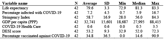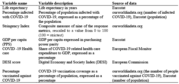 Further, as indicators of a country’s economic maturity, we use GDP per capita in purchasing power parity as the health system quality proxy indicator, which could lead to dampening the excess mortality, and finally to life expectancy changes4. Internet users, fixed broadband subscriptions, internet bandwidth and mobile broadband subscriptions as a sub-index of a country’s digitalization readiness, which not only indicates the ability of countries to adopt and use current information and communication technologies. We consider that the DESI country score appropriately describes the degree of the application of telemedicine and modern non-contact care, which could have had a dampening effect, especially in the early stages of an outbreak, as well as at the peaks of the spread of the epidemic. Population vaccination rates with COVID-19 vaccines are also thought to be an eliminating factor in the effect of the pandemic on the probability of survival. Likewise, COVID-19 health care expenditures should be considered.