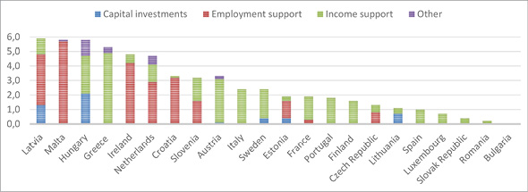 Figures 2 and 3 only illustrate, by using average of the years 2020 and 2021, how different selected EU countries responded to their specific conditions and the pandemic shock, whether in terms of volume, weight of individual fiscal instruments, or different approaches to directing their spending towards households versus corporations, or to stimulating aggregate demand versus supply.