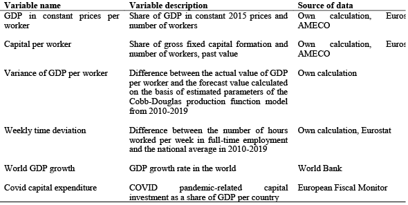 Given the above specificities of the global pandemic crisis, we attempt to explain the hypothesis through modified dependent variables in the form of deviations of labor productivity and inflation from pre-pandemic developments. To test the transmission mechanism of the pandemic shock on changes in economic growth and inflation, the following methodological procedures were applied in the paper.
