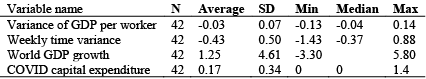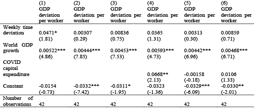 Contrary to expectations regarding Step 2, the deviation of weekly working hours from the long-run average turns out to be a relatively weak predictor of the change in the dynamics of GDP per worker growth during the COVID-19 pandemic (see Table 7). The estimated parameter of this variable is statistically significant only in Model 1, and, even then, only at a 10% significance level. This implies that this variable weakly affects differences in productivity and GDP growth between countries, but not within countries. In contrast, world GDP growth has been found to be an important determinant of differences in GDP per worker across countries. As expected, the direction of the effect is positive, i.e., when the world GDP increases, GDP within countries also increases. In quantitative terms, a 1-percentage-point increase in the world GDP is, on average, associated (ceteris paribus) with an increase in GDP per worker at around 0.5%. Models 4 to 6 also include a variable for the share of capital investment in GDP in the context of the COVID-19 pandemic. The results suggest that countries with a higher share of this expenditure have higher deviations from GDP, while, within countries, this variable does not prove to be a significant predictor of GDP dynamics.