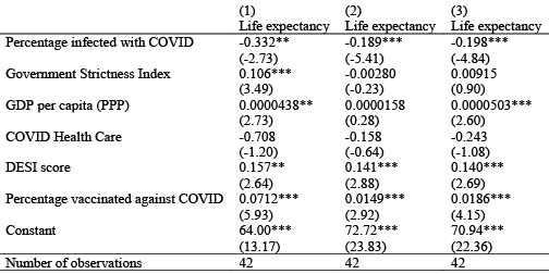 In all three models, the percentage of those infected with COVID-19 is negatively correlated with life expectancy. The models differ in the magnitude of the effect. In the continuous regression model, the effect is the largest, that is, a one-percentage-point increase in the percentage of the infected reduces the life expectancy by 0.33 years on average, ceteris paribus. In fixed or random effects models, the magnitude of the effect is smaller, where an increase in the number of infections induces a reduction in the life expectancy by slightly less than 0.2 years. As for the other variables, in all models, the DESI score and the percentage of those vaccinated against COVID-19 are statistically significant variables. Both variables are positively correlated with the life expectancy, which is in line with expectations. In the pooled regression model, the government stringency index and GDP per capita are additionally statistically significant variables.