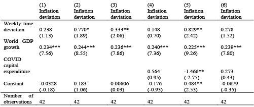 In line with the theory and Hypothesis 3, the model for explaining inflation only gave sufficient confidence in the effect of the world trade demand on growth – the deviation of inflation from the average pre-inflation value for the selected countries. In terms of the fiscal impact, only the COVID-19 growth in capital spending had anti-inflationary effects. The presumed inflationary effect of COVID-19 spending in supporting the demand has not been credibly confirmed over the period. An explanation to be offered is that it had different effects on inflation during the initial phase of the global pandemic crisis and during the growth recovery in 2021, and there were no constraints on the aggregate supply side in the recovery phase form the pandemic shock.