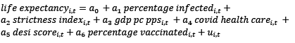Regarding the dependent variable, in this sample, the mean life expectancy is 79.6 years, with values ranging from 72.9 to 83.3 years. Regarding the main explanatory variables, the mean value of the percentage of the population infected with COVID-19 is 7.2%, with values ranging from 0.7% to 16.7%; the mean value of the stringency index in the sample is 58.7, with values ranging from 28 to 84.3; and, finally, the mean value of the percentage vaccinated against COVID is 34.8%, with values ranging from 0% to 90.9%.