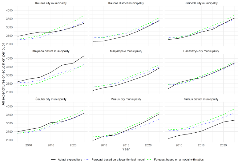 The coefficients of the equation indicate that, when comparing municipalities identical in all other characteristics, a one-percent increase in the number of pre-school pupils can be associated with a 0.22 percent rise in education costs, while a one percent increase in general education students can be associated with a 0.19 percent rise in education costs. The rise in student enrolment in the municipality of Neringa significantly affects the educational expenses there. In this municipality, a one percent rise in the number of general education pupils can be associated with a 0.28 percent increase in educational expenditure. The number of educators in Lithuanian schools is strongly tied to the number of pupils, although certain distractions from the general trend in different municipalities can, of course, arise. A one percent increase in the number of educators across all educational institutions can be associated with a 0.32 percent rise in educational expenditures. The infrastructure and inventory utilised for training purposes, along with the necessity for funding for their maintenance and service, are represented by the physical area variable. The estimation results indicate that an increase of one percent in the school area can be associated with a 0.16 percent rise in educational expenditures. These factors are the essential variables that directly determine the transfers from the central government for educational purposes, which can be directly linked to the requirement to educate a specific number of pupils, to employ the corresponding number of teachers, and to sustain the essential infrastructure. The nominal gross domestic product is one of the best indicators of the country’s overall economic situation and is the best representative of the possibility and necessity to annually index costs for all municipalities. Its estimated effect has a value of 1.05, which means that a one percent increase in nominal GDP is associated with slightly over a one percent increase in educational spending overall in the country. This finding is in line with the fact that spending for educational purposes in Lithuania grew up a little faster than for other purposes in recent years: a one percent increase in the nominal income in the country results in an average expenditure growth of 1.05 percent on education. The indicator of municipality added value, which illustrates the disparities among individual municipalities and their respective capacities for enhanced education funding, indicates that municipalities creating greater added value tend to exhibit marginally elevated educational expenditures – specifically, a one percent increase in added value can be associated with a 0.06 percent rise in educational spending. The final factor, the 2021 dummy, reflects the decision to provide significant funding for educational needs in 2021, despite the COVID-19 pandemic’s negative economic impact on the results in the year 2020.