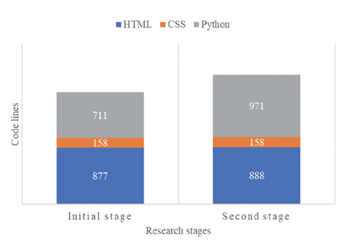 As shown in the Fig. 2, in the first stage, the students generated 877 lines of HTML, 711 lines of Python, and 158 lines of CSS. The second stage slightly exceeded these figures, with 888 lines of HTML, 971 lines of Python, and 158 lines of CSS.
