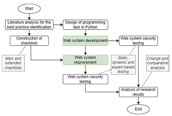 The research was designed (see Fig. 1) to gather the needed data to answer research questions and guarantee that the data are trusted. The research was started by analyzing different sources for building main and extended checklists for security assurance level of a Python and Flask micro web framework-based project.