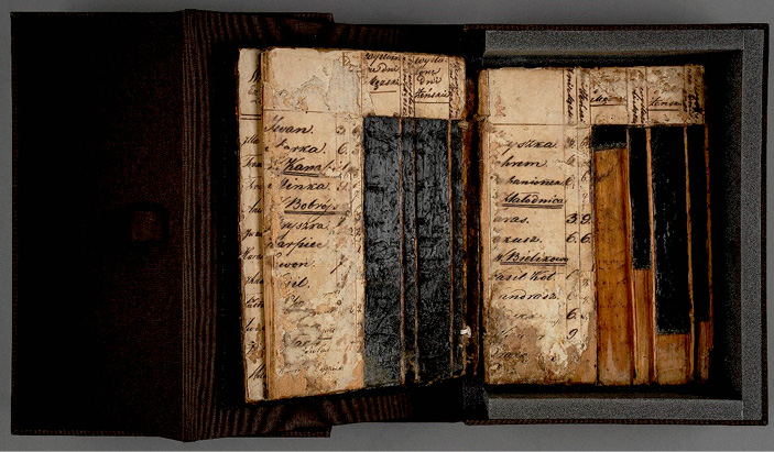 c) Vaškinėse lentelėse vartojama lenkų kalbos ortografija43 neleidžia šio dokumento priskirti ankstesniam nei XIX–XX a. pirmosios pusės laikotarpiui. Tačiau negalima atmesti prielaidos, kad vaškinės lentelės yra senesnio laikotarpio, nes apačioje, po nusitrynusiomis viršutinio popieriaus juostelėmis su įrašais lenkų kalba, matyti senesni popieriaus su įrašais kirilika neįskaitomi fragmentai. Tikėtina, kad lentelės galėjo būti naudojamos ilgesnį laiką, kuomet keitėsi ir vaškinių lentelių savininkai. Tokios prielaidos naudai liudytų pakitusi įrašų kalba, raidynas, rašysena ir kt. Dėl šios priežasties jų datavimas yra komplikuotas ir kol kas negali būti tikslus.