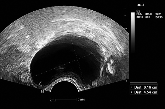 Apžiūrint per makštį – vulva ir makštis be matomų patologijų, makštyje – negausios šviesios išskyros, makšties gleivinė atrofiška, gimdos kaklelis epitelizuotas, uždaras, gimda ir gimdos priedai palpuojant neskausmingi. Transvaginalinio echoskopinio tyrimo duomenys: gimda retroversio padėtyje, 34x26 mm dydžio, gimdos dugne pastebėtas 8 mm dydžio kalcinuotas miomos mazgelis, gimdos gleivinė – 5 mm, homogeniška, dešiniosios kiaušidės projekcijoje nustatytas 6,2×4,5 cm dydžio cistinis darinys (žr. 2 pav.), užpildytas skaidriu turiniu, be kraujotakos, be intarpų, laisvo skysčio, papildomų darinių mažajame dubenyje nerasta. Atlikti kiaušidžių vėžio žymenys kraujyje: CA 125 (kU/l) 17,6 (norma <35 kU/L); HE4 (pmol/l) 71,2 (norma <140 pmol/l po menopauzės); ROMA indeksas (pomenopauzė) (%) 15,9 (rezultatas, lygus 12,5 % arba didesnis, reiškia aukštą epitelinio kiaušidžių vėžio riziką). Stebint pacientę nustatyta, kad cistinis darinys dešinėje kiaušidėje padidėjo nuo 2,7 cm iki 6,2 cm, todėl rekomenduotas operacinis gydymas – laparoskopinė abipusė salpingoovarektomija. Operacijos metu dešinėje kiaušidėje rastas apie 5‒6 cm dydžio cistinis darinys, kiti pilvo ir dubens ertmės organai – be pokyčių. Į pilvo ertmę suleista 50 ml sol. NaCl 0,9 proc., dalis jo išsiurbta ir išsiųsta citologiškai ištirti. Pašalinti abipusiai gimdos priklausiniai, jie atiduoti patologohistologiniam tyrimui atlikti. Remiantis patologohistologinio tyrimo duomenimis, kairėje kiaušidėje ‒ įterptinės cistos, kairiajame kiaušintakyje patologinių pakitimų nenustatyta. Dešinėje kiaušidėje ‒ įterptinės cistos, nustatytas dešiniojo kiaušintakio serozinis intraepitelinis pažeidimas (angl. serous tubal intraepithelial lesion; STIL) ir paratubarinė cista. Diagnozė šiuo atveju aprašoma kaip STIL – epitelio atipija, nepakankama STIC diagnozuoti. Mikroskopiniame aprašyme nurodyta, kad dešiniojo kiaušintakio fimbrijos epitelyje matyti zonų su epitelio ląstelių branduolių hiperchromija, polimorfizmu, persiklojimu, išnykusios epitelio blakstienėlės. Plonasienė cista išklota suplokštėjusiu epiteliu. Atlikus imunohistocheminį tyrimą, rastas stiprus (+++) p53 branduolinis dažymasis 100 % atipinių ląstelių ir stiprus (+++) Ki67 branduolinis dažymasis 1 % ląstelių. Atlikus operaciją, pacientei rekomenduota ambulatorinė gydytojo akušerio-ginekologo ir šeimos gydytojo priežiūra, paskirta planinė ginekologo konsultacija po 4‒6 mėn. endometriumui įvertinti, vartojant tamoksifeną. Praėjus 6 mėn., pacientė konsultuota gydytojo ginekologo. Patologinių pokyčių gimdoje, gimdos gleivinėje, dubens ir pilvo ertmės organuose nenustatyta.