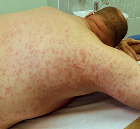 Makulopapulinis bėrimas – dažniausiai pasitaikanti odos reakcija į LTG, įprastai atsirandanti praėjus 4–14 dienų nuo vaisto vartojimo pradžios [13]. Matyti rausvai raudonos dėmės ir papulės, kurios gali susilieti į plokšteles (apvalias ar taikinio formos) (1 pav.) [14, 16]. Dažniausiai bėrimas yra generalizuotas (išplinta kūno, rankų, kojų, rečiau veido srityje), dėstosi simetriškai. Kojose ir pėdose galimas purpuros vaizdas. Tipiškai bėrimų gleivinėse nebūna. Bėrimai gali niežėti, tačiau subjektyvių simptomų gali ir nebūti [14, 17]. Įprastai, nutraukus vaisto vartojimą, makulopapulinis bėrimas išnyksta per savaitę, nepalikdamas randinių ar hiperpigmentinių odos pokyčių. Vis dėlto, toliau vartojant vaistą, bėrimas gali progresuoti iki SDS/TEN [14, 16, 17].