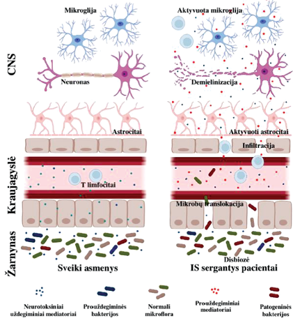 IS sergantiems pacientams būdingas padidėjęs bakterijų patekimas iš žarnyno į kraujotakos sistemą [28]. Disbiozė gali paskatinti patogeninių bakterijų gausėjimą ir kenksmingų toksinų išsiskyrimą, todėl susidaro uždegiminė aplinka ir pažeidžiamas žarnyno barjeras [29]. Dėl padidėjusio žarnyno pralaidumo lipopolisacharidai (LPS) ir kiti bakterijų metabolitai patenka į kraujotaką ir sukelia sisteminį uždegimą [24]. Be to, tam tikros bakterijos gali tiesiogiai veikti imuninę sistemą, reguliuodamos imuninių ląstelių, tokių kaip T, B ląstelės, dendritinės ląstelės bei makrofagai, vystymąsi ir efektyvumą. LPS sukelto uždegimo, žarnyno pralaidumo ir imuninės sistemos suaktyvėjimo derinys sukuria puikias sąlygas lėtinių ligų išsivystymui [29]. Žarnyno disbiozė ir mikrobų translokacija sergantiesiems IS sutrikdo BBB pralaidumą ir skatina CNS reziduojančių ląstelių aktyvavimą. Autoreaktyvios T ląstelės per pažeistą BBB patenka į CNS, o lėtinis mikroglijos ir astrocitų aktyvavimas sukelia šių ląstelių gaminamų uždegiminių mediatorių kiekio pokyčius, taip sukeliamas neurouždegimas. Žarnyno disbiozė taip pat [28]. Be to, žarnyno disbiozė gali lemti potencialių priešuždegiminių bakterijų ir jų pagamintų produktų sumažėjimą, pavyzdžiui, trumpųjų grandinių riebalų rūgščių (SCFA) sumažėjimas gali prisidėti prie uždegimo skatinimo (pav.) [29].