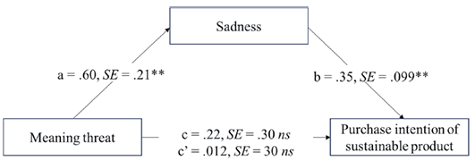Using the PROCESS macro for SPSS, we performed mediation analysis (Hayes, 2022; PROCESS; Model 4, 5000 boot-strapped samples) and observed that the relationship between meaning threat presence (dummy coded, 0 = control; 1 = meaning threat) and intention to purchase sustainable products was mediated by the emotion of sadness. The meaning threat presence (vs. control) increases the extent of sadness felt (path a: B = .78, SE = .20, t(197) = 3.98, p < .001). In turn, the emotion of sadness increases the purchase intention of a sustainable product (path b: B = .21, SE = .094, t(196) = 2.23, p = .027). Next, the direct effect of meaning threat presence (vs. absence) on the purchase intention of sustainable product was not significant (path c’: B = -.041, SE = .27, t(196) = -.15, p = .88), as well as total effect (path c: B = .12, SE = .26, t(197) = .47, p = .64). Importantly, to assess whether the impact of meaning threat presence on the intention to purchase sustainable products is mediated by the emotion of sadness, we assessed the indirect effect. The analysis shows that the impact of meaning threat presence (vs. control) on purchase intention was indeed fully mediated by emotion of sadness as the 95% confidence interval did not include zero (effect = .16, 95% CI [.019 to .35]; see Figure 5).