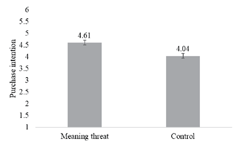 We performed a univariate analysis to evaluate the effect of meaning threat on sustainable purchase intention. The results prove the direct effect of meaning threat (vs. control) on the intention to purchase sustainable product, as a univariate test showed that the purchase intention significantly differed across the conditions. Participants in the meaning threat condition reported greater purchase intention compared to participants in the control condition (Mthreat = 4.61, SDthreat = 1.73 vs. Mcontrol = 4.04,