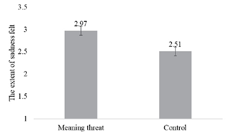 A univariate test was conducted to test the effect of meaning threat on sadness. The result indicates that the extent of sadness felt differed across the conditions. Participants in the meaning threat condition reported feeling more sadness than participants in the control condition (Mthreat = 2.97, SDthreat = 1.58 vs. Mcontrol = 2.51, SDcontrol = 1.18; F(1, 297) = 8.13, p = .005, η2 = .027; see Figure 2).