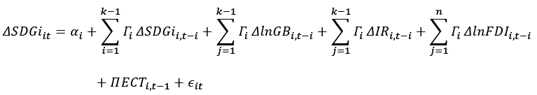 This equation captures the core of the PVECM framework, where the short-term behavior of the SDG index is shaped by its lagged changes along with the variations in the independent variables (green bonds, interest rates, and FDI). Moreover, the incorporation of the error correction term guarantees that any deviations from the long-term balance are progressively corrected over time.