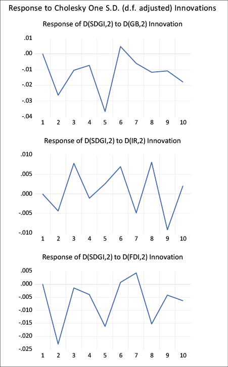 The Foreign Direct Investment (FDI) variable tends to deliver shocks with negative impacts on the SDG index. From the 2nd to the 5th period, the SDG index responds to negative shocks from FDI. However, in the 6th and 7th periods, FDI shocks positively affect the SDG index, although the subsequent periods return to negative impacts. The fluctuating impacts of FDI shocks on the SDG index reflect their complex nature. These fluctuations indicate that the benefits of FDI depend on the investment orientation and the regulations implemented by the recipient country.