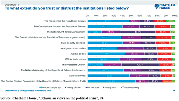 Legitimacy, both internally and externally, plays a crucial role in assessing Belarus’ status as a sovereign state. Internally, Lukashenka’s popular support has wavered throughout the years. While official Belarusian records claim that Lukashenka has held onto power since the birth of the Republic of Belarus,62 instances have arisen where elections did not accurately reflect the will of the population. Interviewee no. 3 emphasised that the 1994 election was “the only legal election ever since,”63 meaning that, despite the lack of concrete evidence until 2020, subsequent elections have often faced allegations of electoral fraud, resulting in extensive scrutiny, numerous protests, and international condemnation.64 Nonetheless, the 2020 elections and protests’ suppression marked a significant turning point in this regard, with growing disillusionment and scepticism towards the government. Indeed, the official outcome of the elections, coupled with evidence of fraud,65 had a profound impact on the social-political landscape of the country. Adding complexity, a series of consequential events, such as the weaponization of migrants,66 the Ryanair incident,67 the presence of Russian troops and the deployment of nuclear weapons in the country68 further fuelled scepticism and negative sentiments towards the authorities. Upon examining national polls conducted by Chatham House shortly after the 2020 elections, illustrated in Figure 3, it becomes evident that a significant majority expressed a severe distrust in Lukashenka and in the State institutions associated with his regime.