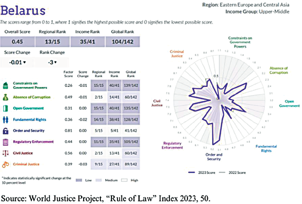 As mentioned before, authority refers to the ability of a government to exercise control over its population and in relations with other states. When analysing Belarus’ Constitution, Article 6 upholds that Belarus shall be bound by the principle of the rule of law. However, in WJP’s Rule of Law Index (2023) Belarus ranks poorly, especially when compared to other countries in the Eastern European and Central Asian region. This is evident from the graphic provided in Figure 1, indicating a significant gap in the country’s adherence to the rule of law. Indeed, with a score of only 0.45 on a scale from 0 to 1, Belarus ranks among the lowest in the region, highlighting the inability of its government to operate within legal boundaries.