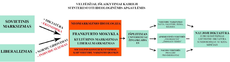 Tuo pat metu galime kalbėti ir apie ryškių propagandinių savybių priskyrimą leftizmui. Šioje perspektyvoje kairumo ideologija išplinta pirmiausia JAV, kur ja „remiantis buvo parengti šalies teisininkai, žurnalistai, politikai ir socialinių mokslų atstovai“64, o paskui ir ES, kurioje „liberalkomunistinis Europos vienijimo projektas perėmė ir pritaikė minėtas neomarksistų idėjas“65. Taip teigiamas susiformavimas propagandinės platformos, kurioje:
