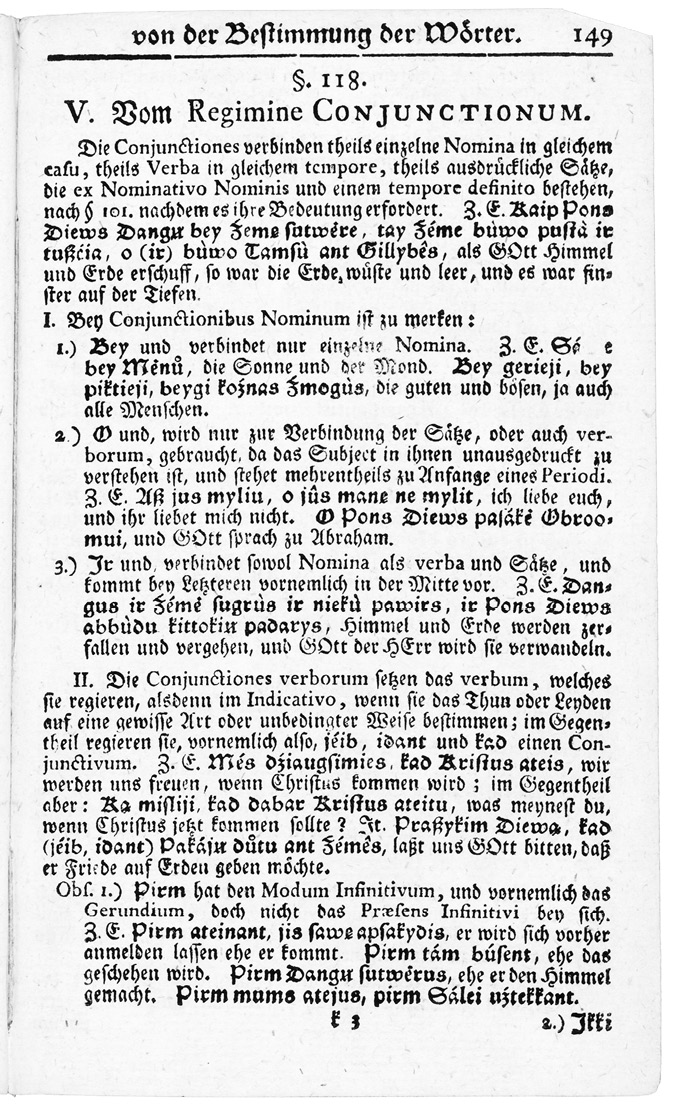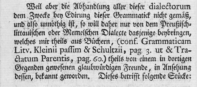 11 Philipp Ruhig, Betrachtung der Littauiſchen Sprache, in ihrem Urſprunge, Weſen und Eigenſchaften; Aus vielen Scribenten, und eigener Erfahrung, mit Fleiß angeſtellet, und ʒu reiferer Beurtheilung der Gelehrten, ʒum Druck gegeben, von Philipp Ruhig, Pfarrern und Seniore ʒu Walterkehmen, im Hauptamt Inſterburg, Knigsberg, druckts und verlegts Iohann Heinrich Hartung, 1745, p. 60–62.