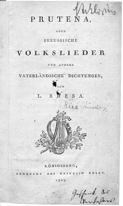8 L[udwig] Rhesa, PRUTENA, oder preussische VOLKSLIEDER und andere vaterländische Dichtungen, Königsberg: Heinrich Degen, 1809; Idem, PRUTENA, oder vaterländische Lieder und Dichtungen, Zweiter Theil, Königsberg: Verlag der Hartungschen Hofbuchdruckerei, 1825.