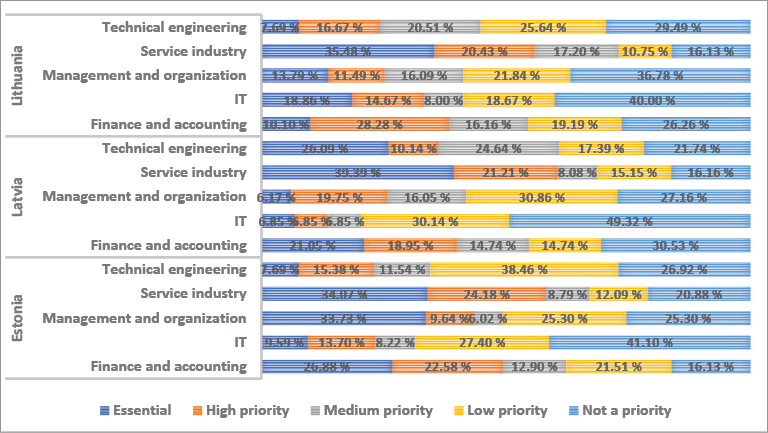 It is important for investors to easily access their subsidiary from abroad. All business sectors, which participated in the study, belong to tertiary sector of economy to service support field. Information and communication technology (hereinafter IT), finance and accounting, management and organization, technical engineering and service industry are the participants of the research. Using Eurostat data, the fastest developing sector in Lithuania, Latvia and Estonia is information and communications technology with 42k IT specialists employed (Invest Lithuania, n.d.) in Lithuania, 36k people employed in Latvia (Invest Latvia, n.d.) and with workforce of over 20k people in Estonia (Invest Estonia, n.d.). Also, the most demand for IT professionals was obvious from the highest number of the offered occupations compared to other on the job portal. On the portal IT sector lists such occupational fields as software development (front end), software development (back end), IT service desk, cloud operations, infrastructure development, big data analytics, data science, business intelligence, cyber security, infrastructure management, artificial intelligence.